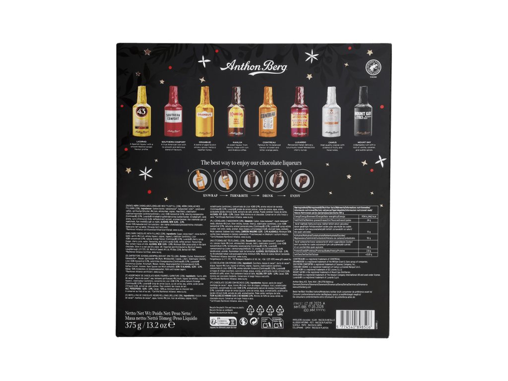 Elegantní adventní kalendář pro muže s alkoholem obsahuje 24 čokoládových lahviček se světovými likéry. Kalendář Anthon Berg je vhodný jako dárek pro muže v předvánočním čase. Čokoládové lahvičky mají náplně jako The Famous Grouse, Cointreau, Drambuie, Jim Beam, Remy Martin nebo Canadian Cl. Dopřejte svému manželovi, příteli či tatínkovi tento jedinečný kalendář