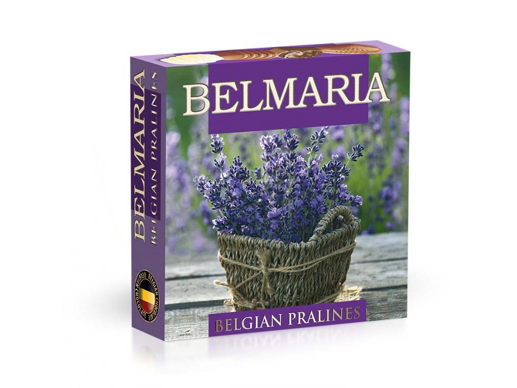 Belgické pralinky z mléčné, hořké a bílá čokolády s náplní v malé bonboniéře s motivem levandule