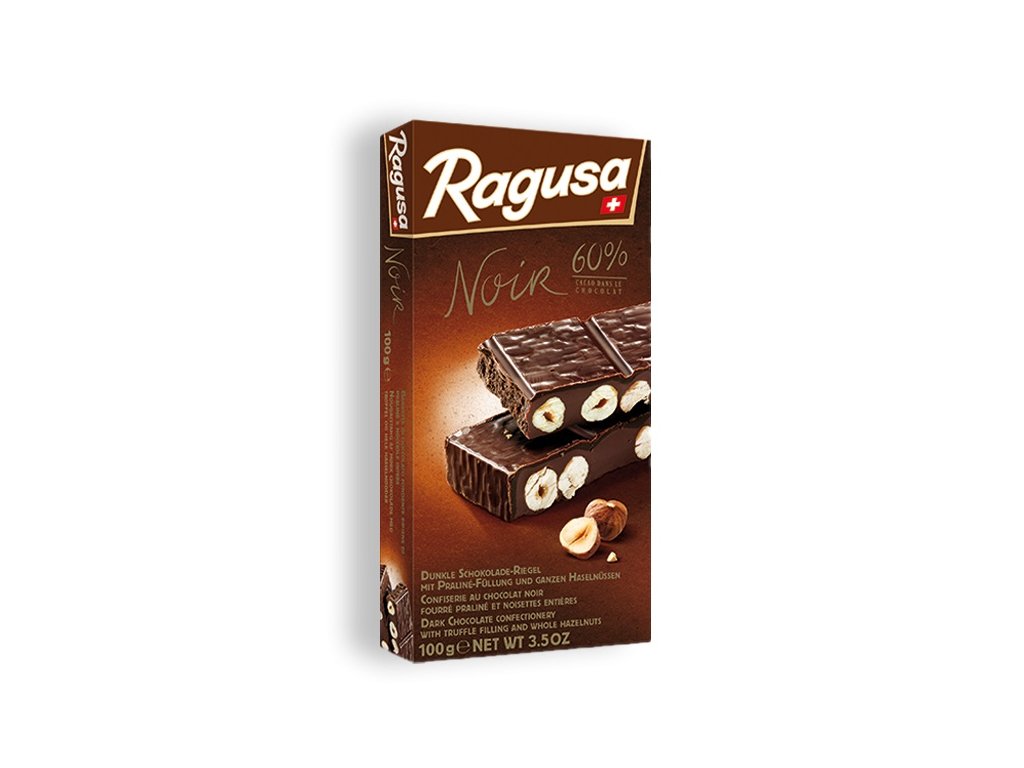 Představujeme Vám Ragusu švýcarskou hořkou čokoládu s lískooříškovým nugátem a ořechy. Ragusa to je čokoládový zážitek. Již na první pohled upoutá design krabičky a její pevný karton. Po jejím otevření se objeví dva padesátigramové obdelníky plné nugátu a ořechů. Pro Ragusu jsou typické nakrájené bločky, kdy vyniká nugát, celé lískové ořechy a čokoláda láká k zakousnutí.