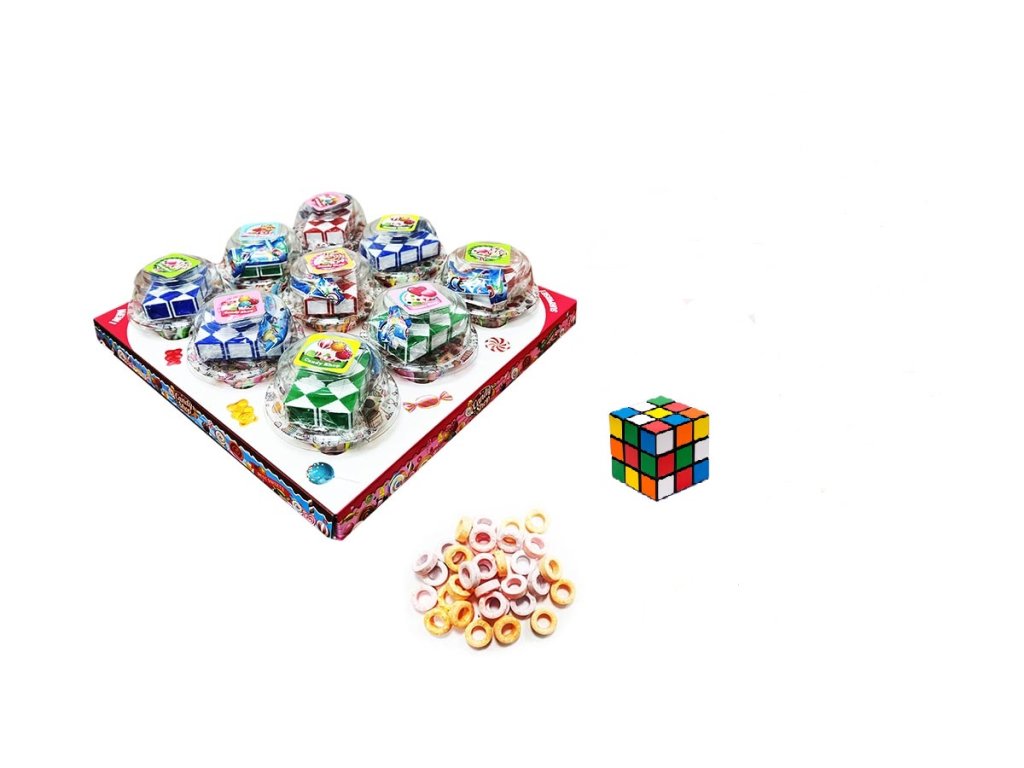 Originální kombinace sladké odměny a zábavné hlavolamové kostky! Každé balení obsahuje 12 kusů plastových skládacích kostek v různých barevných provedeních, uvnitř kterých najdete drobné ovocné bonbony. Ideální jako dárek, odměna nebo atraktivní zboží do dětských koutků.