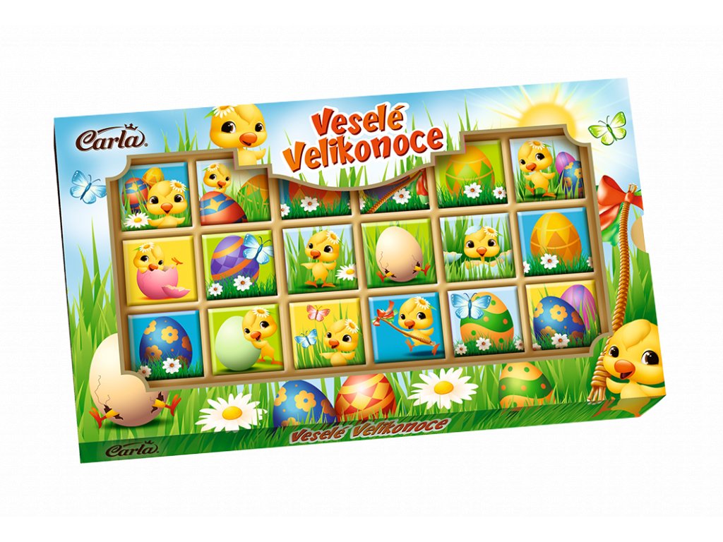 Malé velikonoční čokolády s roztomilými obrázky kuřátek a vajíček. Dárkové balení neapolitánek Veselé Velikonoce je vyrobené z kvalitní české mléčné čokolády. Obdarujte koledníky tímto dárkovým balením, případně můžete čokoládky darovat jednotlivě.