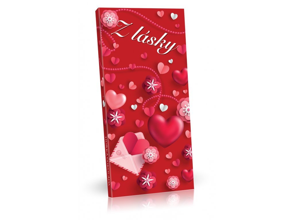 Lahodná hořká čokoláda. Plná srdíček s textem Z lásky. Darujte partnerovi jen tak z lásky nebo jako dárek k Valentýnu