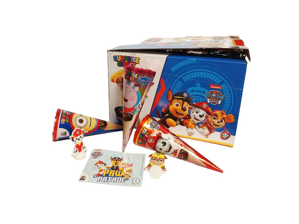Dopřejte dětem sladké překvapení! Tento křupavý waflový kornoutek je naplněný lahodným lískooříškovým krémem a barevným dražé, které dodá každému soustu hravou chuť. Každý kornoutek je zabalený v atraktivním dětském motivu (např. oblíbené animované postavičky), takže je ideální jako malý dárek, odměna nebo součást dětské oslavy.