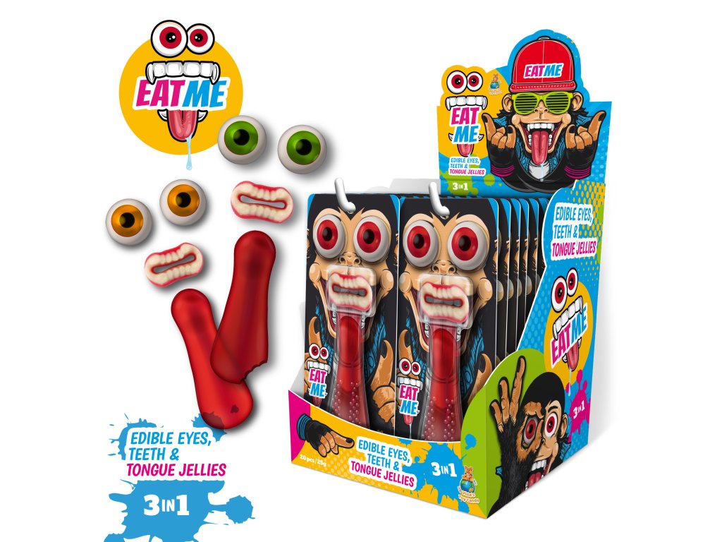 Zábavné a trochu strašidelné želatinové dobroty Eat Me jsou ideální pochoutkou pro všechny malé i velké milovníky netradičních sladkostí! Balení obsahuje mix želatinových zubů, očí a jazyků s ovocnou příchutí, které nejen skvěle chutnají, ale i pobaví svým vzhledem. Perfektní jako doplněk na dětské oslavy, Halloweenské párty nebo jen tak pro zábavné mlsání.