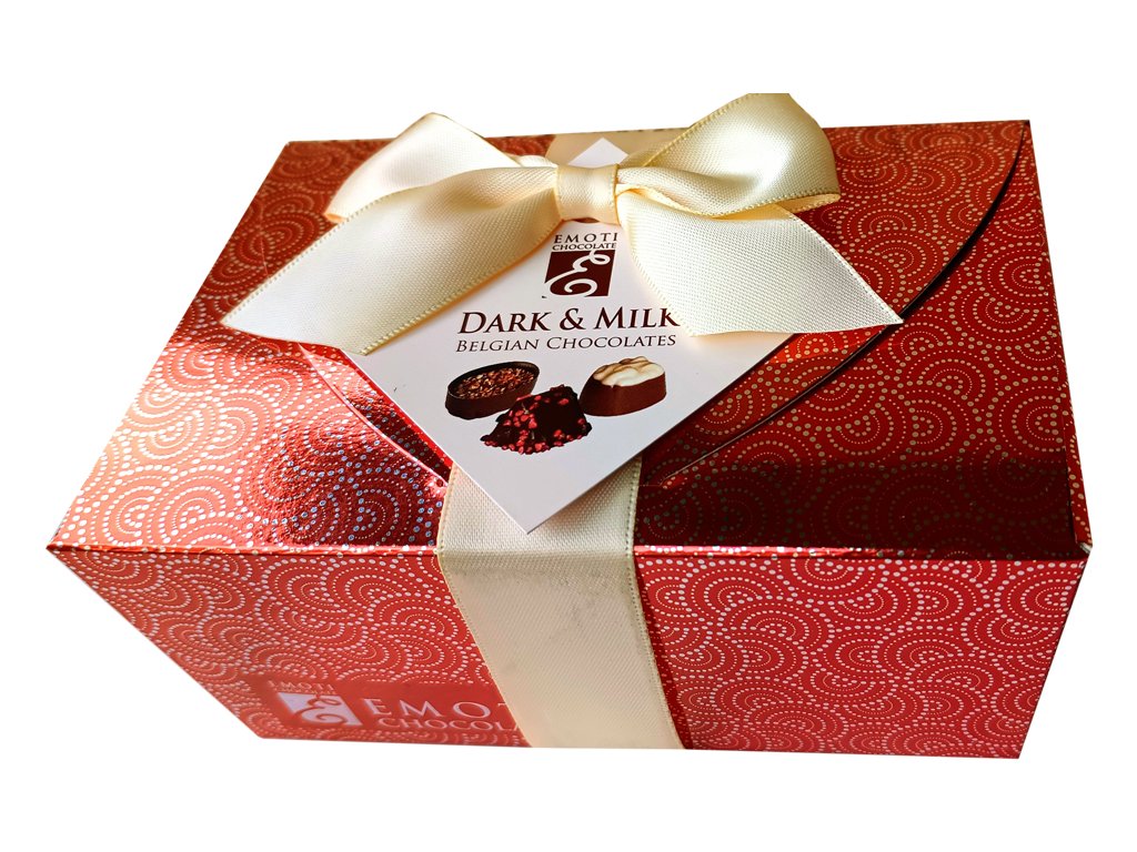 Dárkové balení Emoti belgických pralinek obsahuje mléčné a hořké pralinky s náplní. Dárkové balení v červené barvě s mašlí bude krásným a chutným dárkem