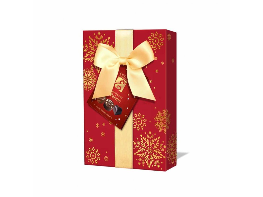 Vánoční bonboniéra obsahuje 9 belgických pralinek z vynikající hořké čokolády s jedinečnými náplněmi ze kterých si vybere každý. Lískooříšková, nugátová a karamelová nebo marcipánová, které se jemně rozplynou v ústech a zanechají příjemnou chuť. Luxusní bonboniéra s vánočním motivem ozdobená zlatou mašličkou je skvělý tip na dárek, který osloví každého a vytvoří vánoční atmosféru.