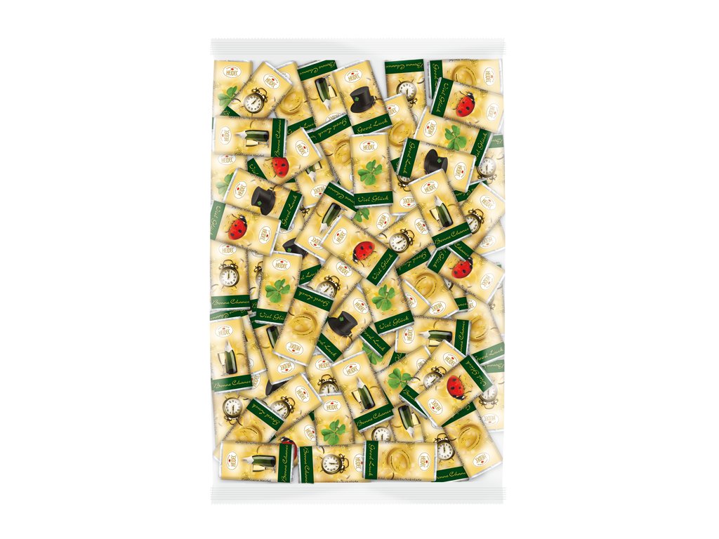Malé mléčné čokoládky s motivy symbolů štestí jako je podkova, beruška, čtyřlístek. Balení obsahuje cca 80ks čokoládek
