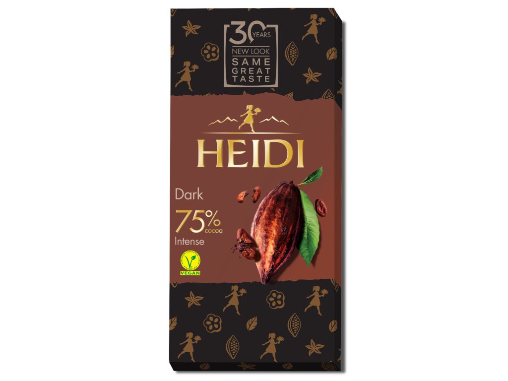 Ne nadarmo má tato hořká čokoláda v názvu Intense. Intenzivní chuť 75% obsahu kakaa řadí tuto Heidi čokoládu do předních příček vysokoprocentních čokolád. Heidi čokoláda je velmi tenká a chuť kakaa tak lépe vyniká. Nechte si kousek rozpustit na jazyku a přesvěčte se sami