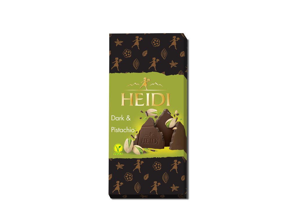 Tabulková čokoláda HEIDI Dark & Pistachio je stvořena pro milovníky intenzivní chuti a prvotřídní kvality. Očekávejte sytou, sametově hořkou čokoládu s vysokým obsahem kakaa, jejíž hluboká chuť je mistrovsky doplněna velkorysým množstvím křupavých kousků pistácií. Každý čtvereček nabízí sofistikovaný zážitek – nejprve se rozvine typická hořkost, která následně ustoupí jemné, máslové a lehce slané chuti pistácií.
