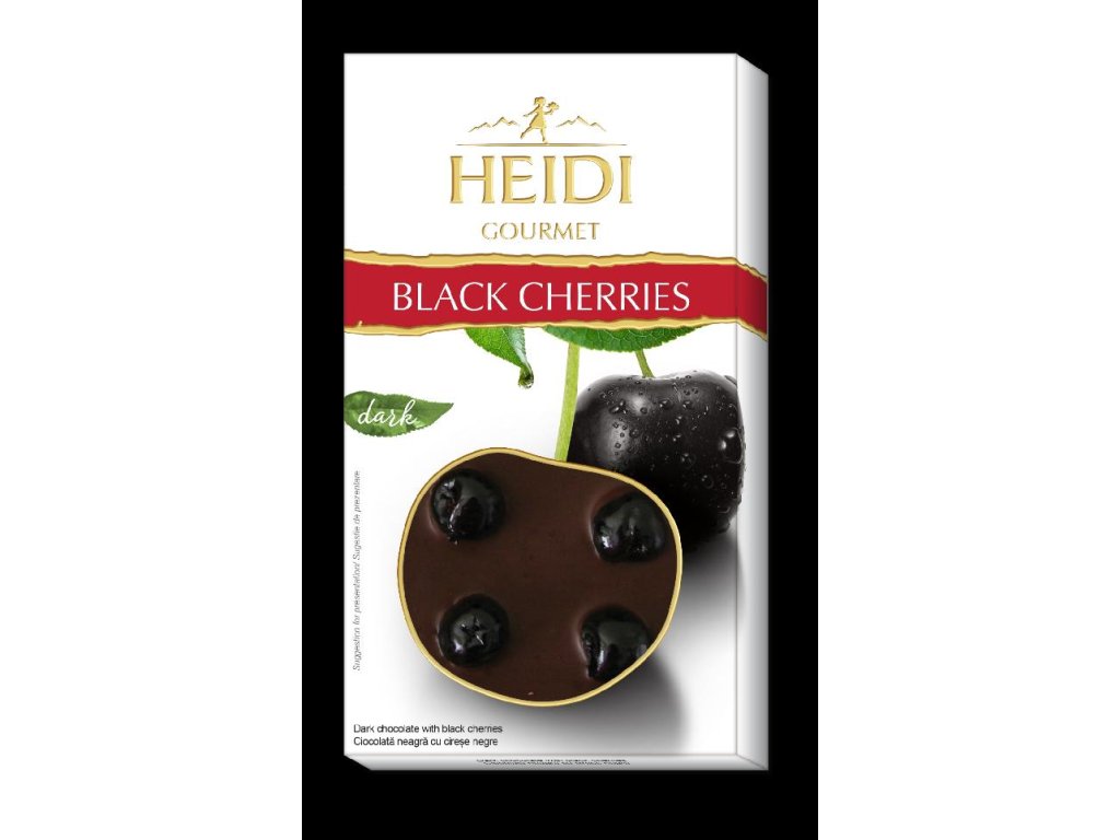 Pokud jste milovníci hořké čokolády a ovoce, pak Vás zaručeně potěšíme touto čokoládou. Slabá hořká čokoláda s obsahem kakaa 50% je sypaná šťavnanými kandovanými třešněmi. A pokud nejste příznivci hořké čokolády,nebojte se jí, bude vám chutnat stejně jako nám. Čokoláda totiž nepůsobí chuťově příliš hořce a lahodné třešně jí dodávají sladkou štavnatou chuť. Bílý obal Heidi čokolády působí luxusně a čokoláda se tak stává krásným a chuťově vynikajícím dárkem