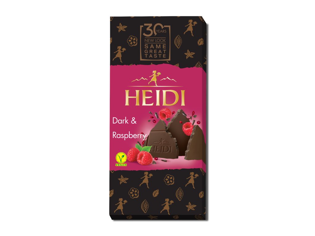 Heidi Dark Raspberry je lahodná tabulka jemné hořké čokolády, která v sobě ukrývá kousky svěžích, lyofilizovaných malin. Tato kombinace vytváří dokonale vyváženou chuť – hořkost čokolády se snoubí s ovocnou svěžestí a lehkou kyselostí malin. Čokoláda je zabalena v elegantním a stylovém obalu, který působí luxusně a dělá z ní ideální drobný dárek pro každou příležitost – ať už chcete potěšit své blízké, kolegy nebo sami sebe.