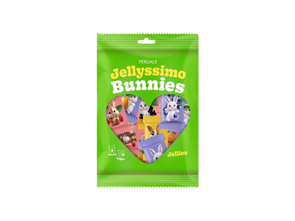 Jellyssimo Bunnies jsou lahodné ovocné želé bonbónky, které potěší nejen svou chutí, ale i roztomilým vzhledem. Každý bonbónek je jednotlivě balený s obrázkem zajíčka, což z nich činí skvělý dárek k velikonocům nebo sladkost pro každou příležitost. Bonbóny jsou vyrobené z kvalitních ingrediencí a nabízí osvěžující ovocné příchutě, které rozveselí vaše chuťové buňky. S hmotností 150g je balení ideální pro sdílení s přáteli nebo jako malý sladký zážitek pro sebe.Tato sladkost je perfektní pro všechny, kdo mají rádi barevné a chutné želé s veselejším motivem!