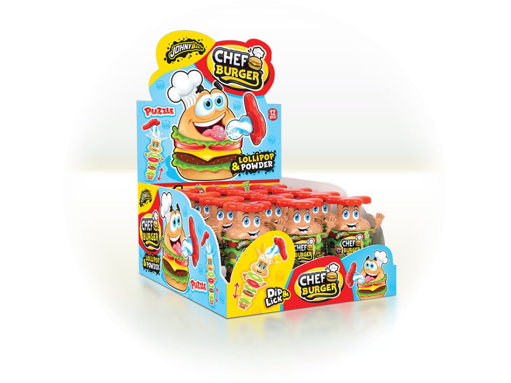 Lízátko ve tvaru šéfkuchaře hamburgeru s ovocným práškem