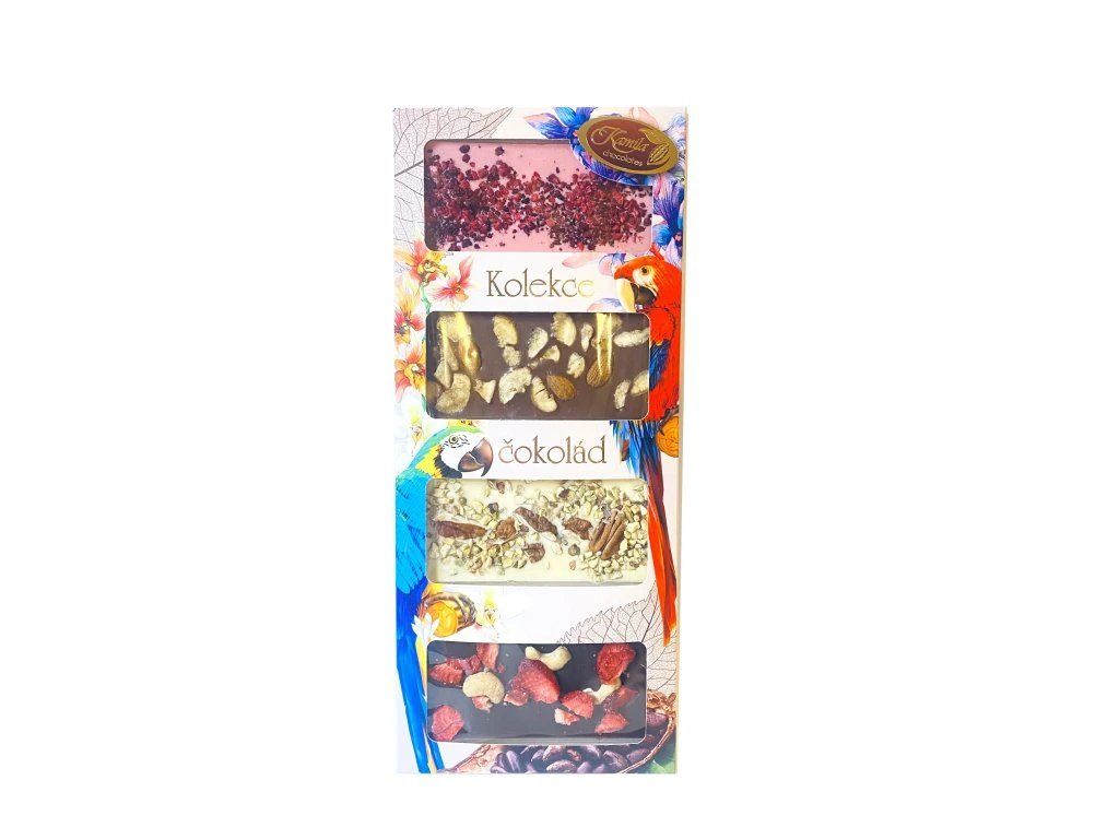 Dárková kolekce čtyř druhů luxusní čokolády zdobené ovocem a oříšky