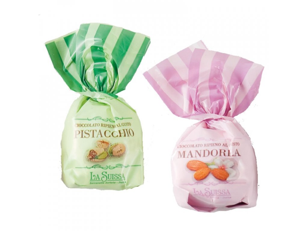 Italské pralinky z mléčné a hořké čokoldy plněné jemným mandlovým a pistáciovým krémem.