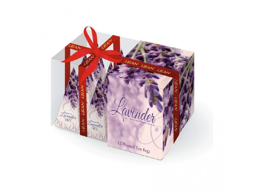 Černý a zelený čaj s levandulovými pupeny v jednotlivě balených pyramidách v dárkovém balení