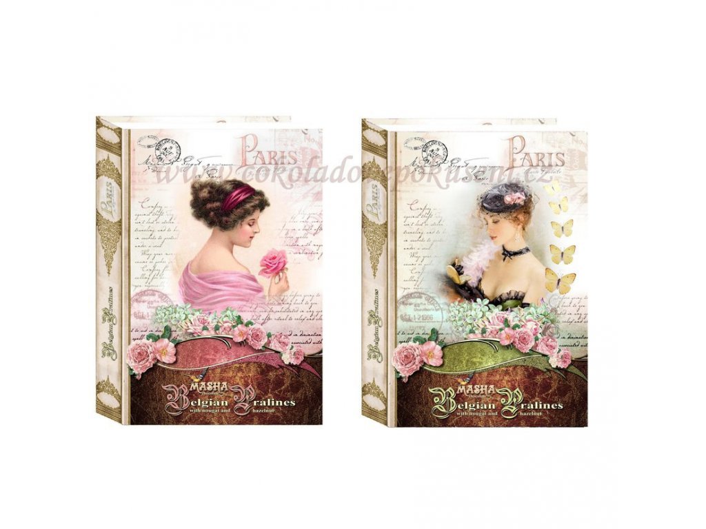 Bonboniéra Masha ve tvaru knihy s nádherným motivem krásných retro žen přináší nejen vizuální eleganci, ale i gurmánský zážitek. Uvnitř najdete pralinky z jemné belgické mléčné čokolády, plněné krémovým lískooříškovým nugátem a doplněné křupavým lískovým oříškem. Toto stylové balení o hmotnosti 200 g je ideální jako dárek, který potěší nejen svou výtečnou chutí, ale také originálním designem inspirovaným retro estetikou. Perfektní volba pro všechny, kdo milují kvalitní čokoládu a krásu klasického stylu.