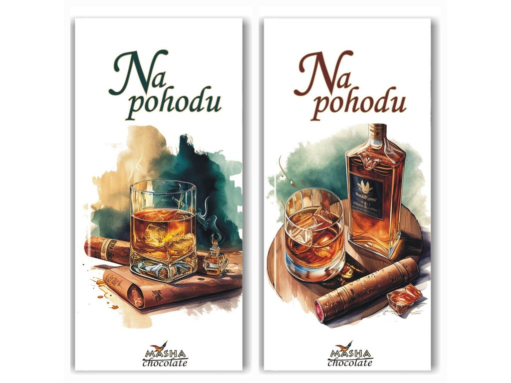 Mléčná ači hořká čokoláda s motivem whisky a textem Na pohodu. Při odběru více kusů mix obou druhů