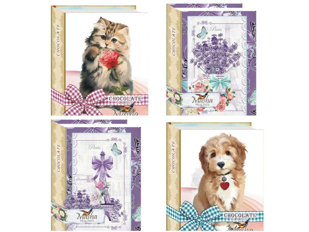 Objevte kouzlo sladkého potěšení s elegantní bonboniérou Masha ve tvaru knihy! Tato 85g bonboniéra s nádhernými motivy pejska, kočičky nebo levandule ukrývá lahodné mléčné pralinky s jemnou oříškovou náplní. Skvělá volba jako dárek pro milovníky sladkostí i krásných detailů. Ideální pro potěšení blízkých nebo jako malá sladká odměna pro sebe!