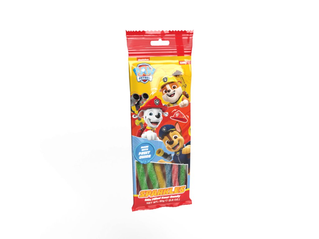 Barevné kyselé pendreky s ovocnou příchutí potěší všechny malé i velké milovníky sladkostí! Tento balíček s oblíbenými postavičkami z animovaného seriálu Paw Patrol je ideální jako odměna, dárek nebo sladké překvapení do svačiny. Pendreky jsou měkké, s ovocnou náplní a posypané kyselým cukrem, který dodá výraznější chuť. Vyrobeno s ovocnou šťávou pro ještě lepší chuťový zážitek.