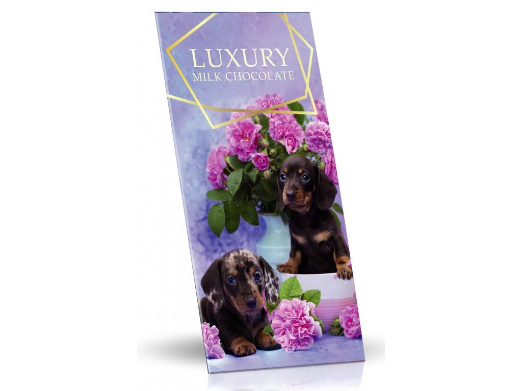 Mléčná čokoláda s mandlemi a malinami s obrázkem roztomilých pejsků