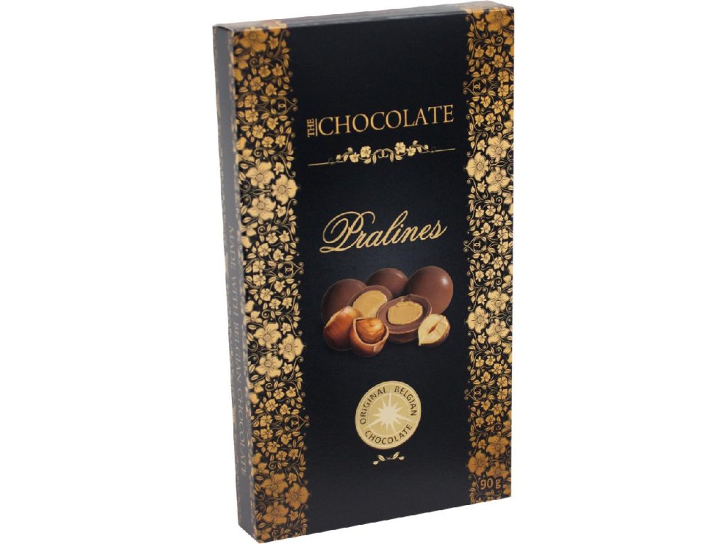 Originální belgické pralinky z mléčné čokolády formované s lískooříškovou náplní v černozlatém designu
