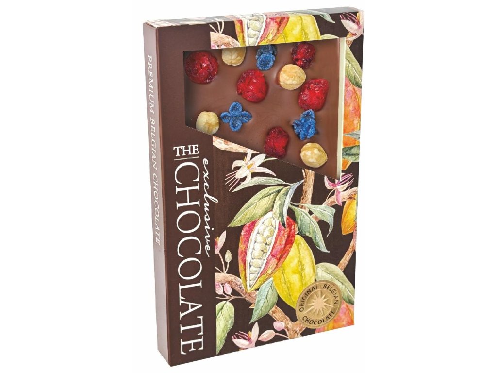 Mléčná čokoláda bohatě zdobená oříšky, třešněmi a fialkami
