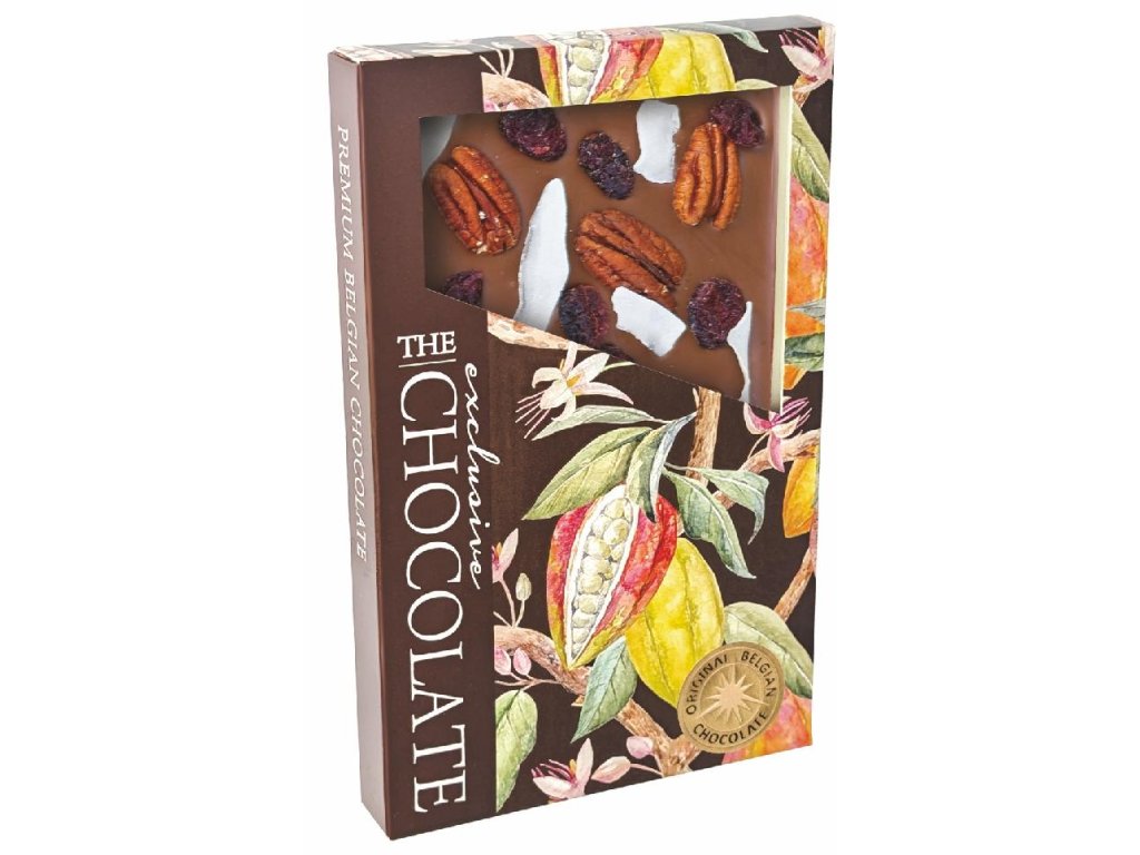 Mléčná čokoláda s pekanovými oříšky, brusinkami a kokosem v originálním obalu