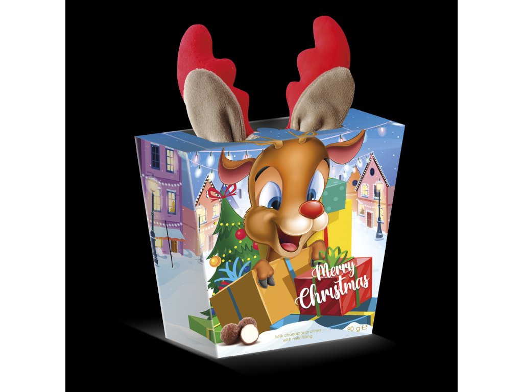 Mléčné čokoládové pralinky v dárkovém balení s motivem soba s dárkem v podobě čelenky