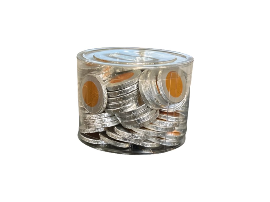 Bohatství, které opravdu chutná! Těhle 100 stříbrnozlatých čokoládových eur ti sice kapsu nenaplní, ale zato rozzáří den. Každá mince má průměr 45 mm a je vyrobená z kvalitní mléčné čokolády, která se krásně rozplývá na jazyku. Balené v praktické dóze – ideální na párty, jako malá pozornost nebo sladká odměna. Zlato i stříbro na jednom místě... a všechno k nakousnutí!
