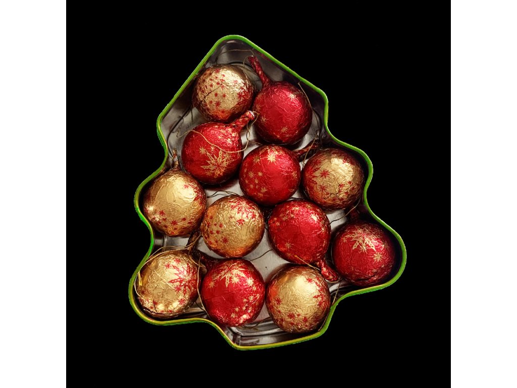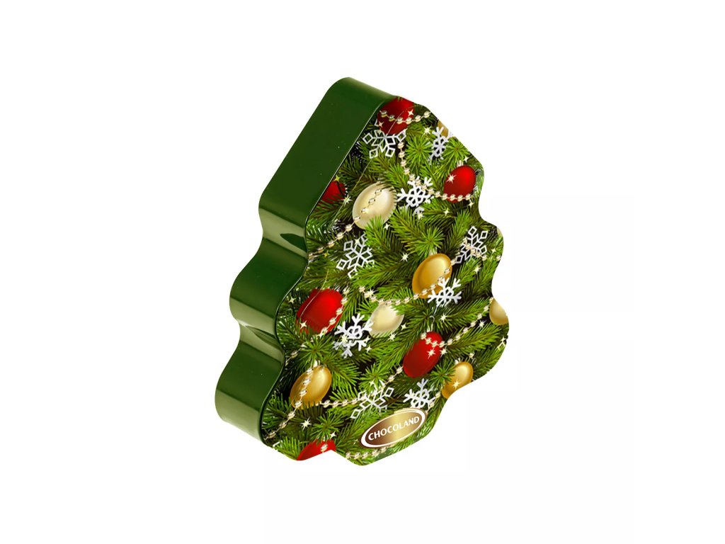 Vánoční plechová dóza stromeček naplněná kouličkami z mléčné čokolády