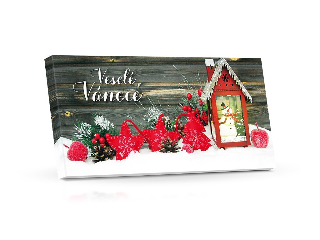 Vánoční hořká čokoláda potěší svým vánočním designem s obrázkem vánočních dekorací a lucerny se sněhulákem. Hořká čokoláda bude praktickým čokoládovým dárkem ale i čokoládou do dárkového koše či balíčku