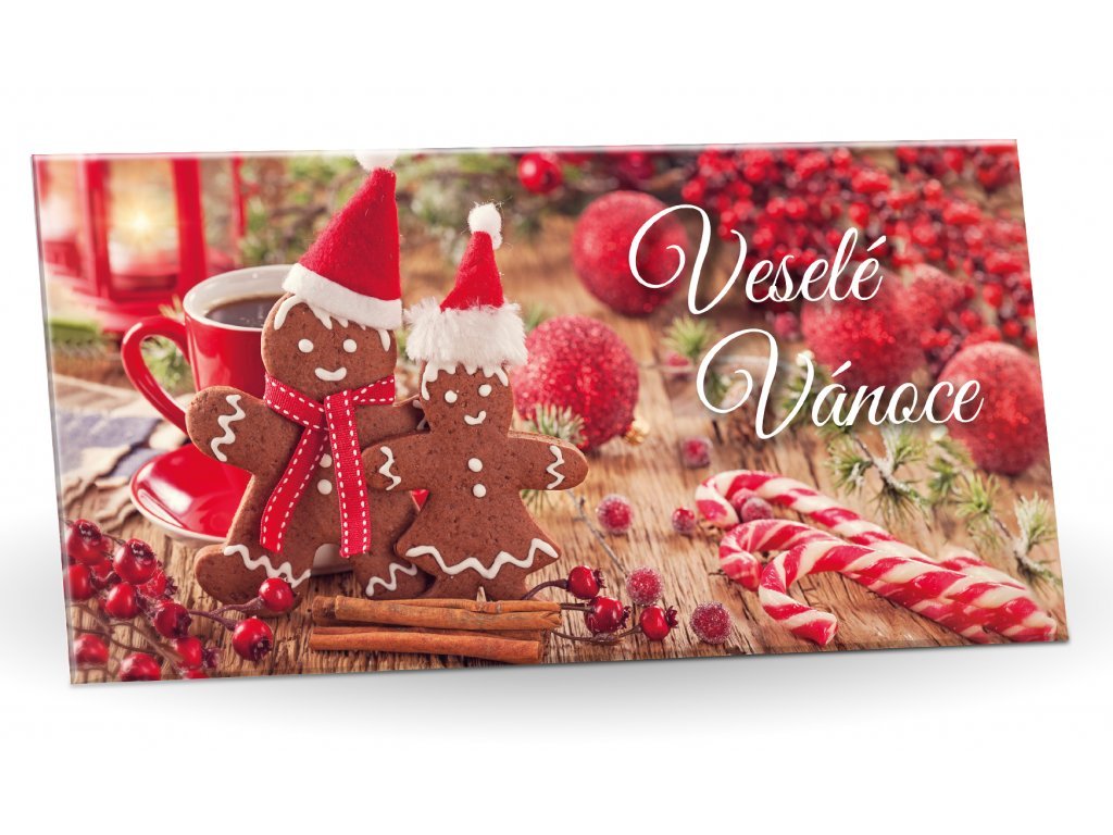 Hořká čokoláda 60% s vánočním motivem perníčků a nápisem Veselé Vánoce