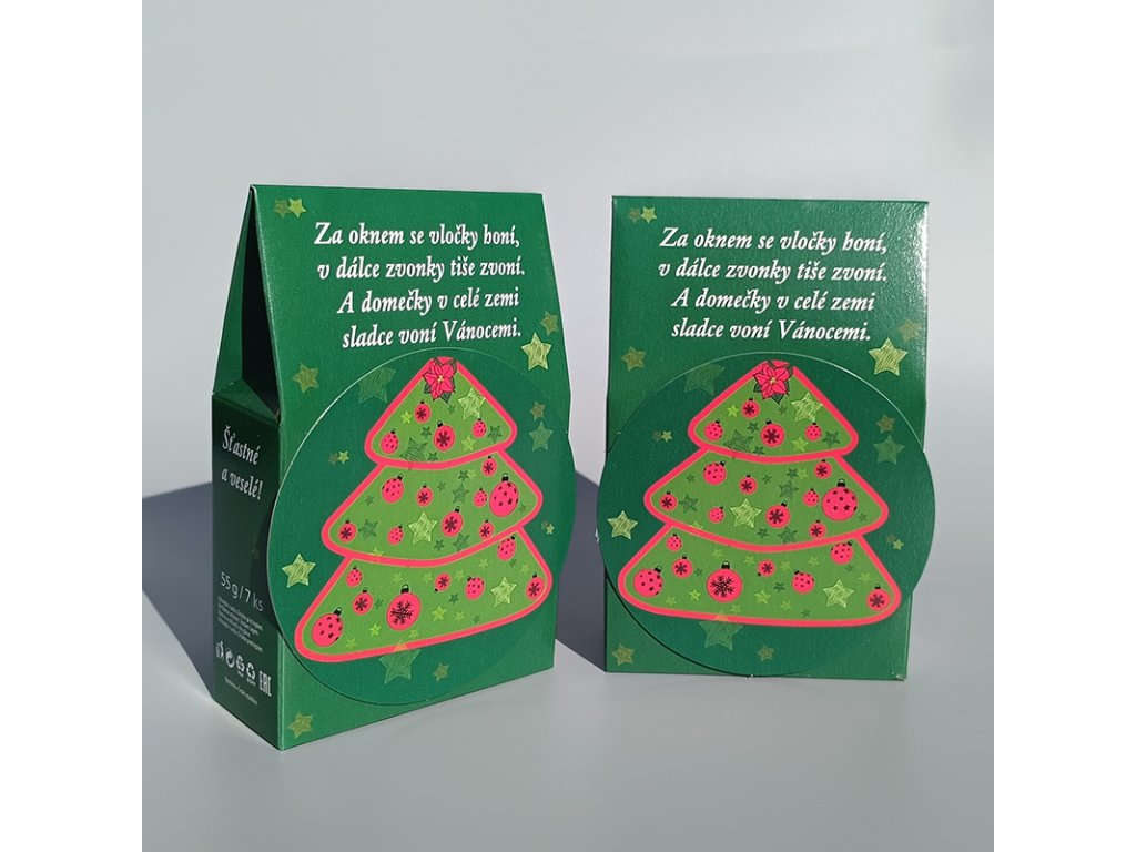 Tyto vánoční lázněnky dozdobí vánoční balíček i koš díky své vánoční básničce i stromečku na obalu. Vánoční oplatky s náplní skořice a kakaa budou sladkou pozorností ve vánočním čase ke kávě i čaji.