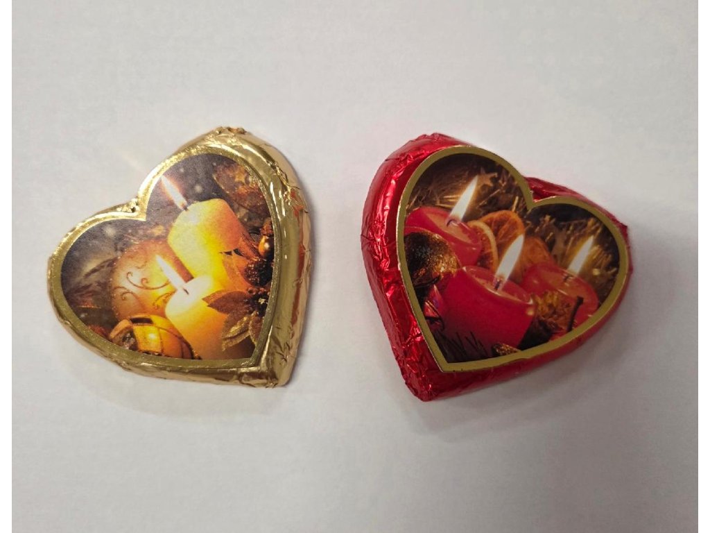 Okouzlující vánoční nugátová srdíčka jsou ideální drobností pro vytvoření sváteční atmosféry. Každé srdíčko je pečlivě zabalené do zlaté či červené folie, která je zdobena hořícími svíčkami. S hmotností 24 g je toto čokoládové srdíčko perfektní jako malá pozornost, ozdoba na dárek nebo stylová dekorace vašeho svátečního stolu. Je to jednoduchý a krásný způsob, jak potěšit své blízké během Vánoc.