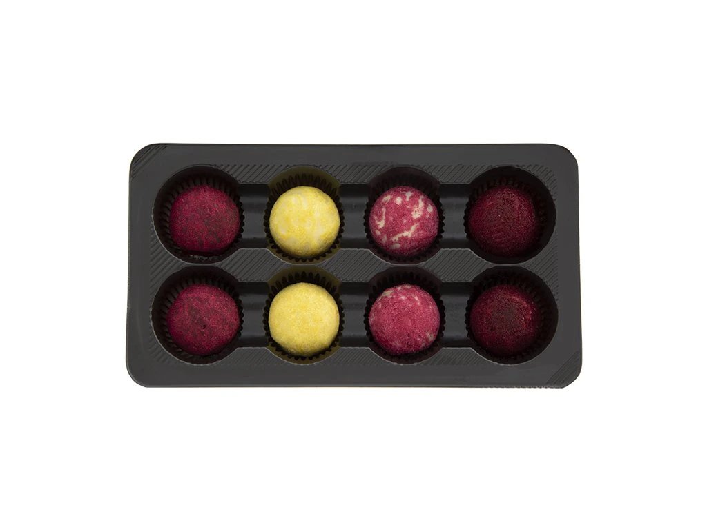 Výběr čokoládových truffles ve vánoční bonboniéře s červenozlatými kouličkami