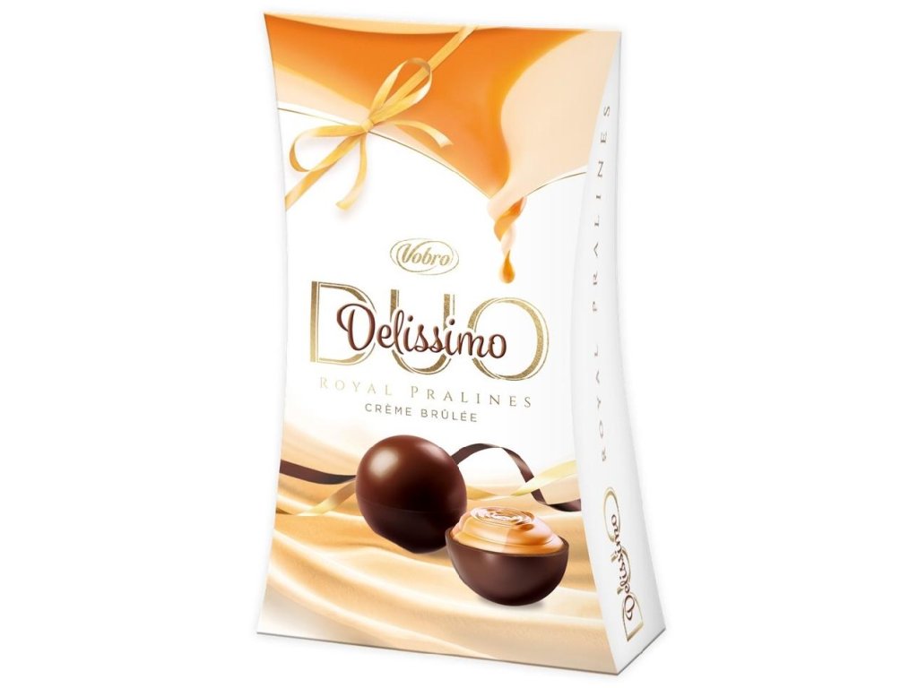 Objevte sladké potěšení v podobě bonboniéry Vobro Delissimo Crème Brûlée. Tato elegantní bonboniéra ukrývá výběr jemných pralinek, které v sobě spojují neodolatelnou chuť náplně inspirované francouzským dezertem crème brûlée a kousky křupavého karamelu. Každý bonbon je malým mistrovským dílem, které přináší harmonii sladkého krému a zlatavého karamelu v  lahodném čokoládovém obalu. Ideální jako dárek nebo stylové pohoštění k výjimečné chvíli.