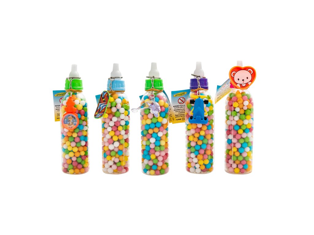 Kojenecké lahvičky plněné cukrovými perličkami v různých příchutí s klíčenkou
